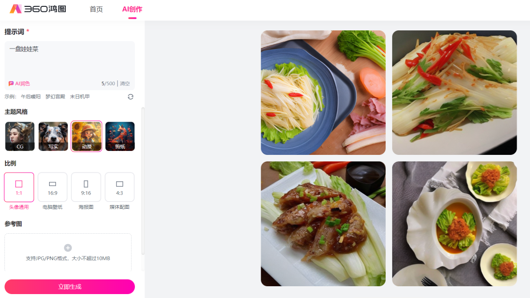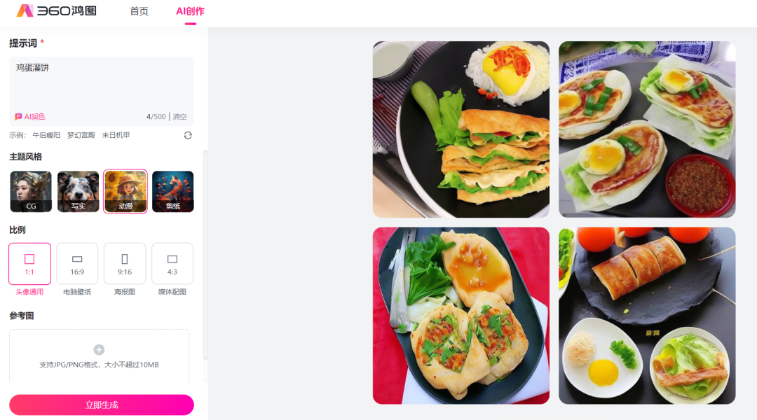 我又试了试娃娃菜与鸡蛋灌饼这两个经常翻车的绘画素材,没想到「360 鸿图」的理解都非常准确,画面生成的内容完全符合我的要求,不得不说确实很实用。