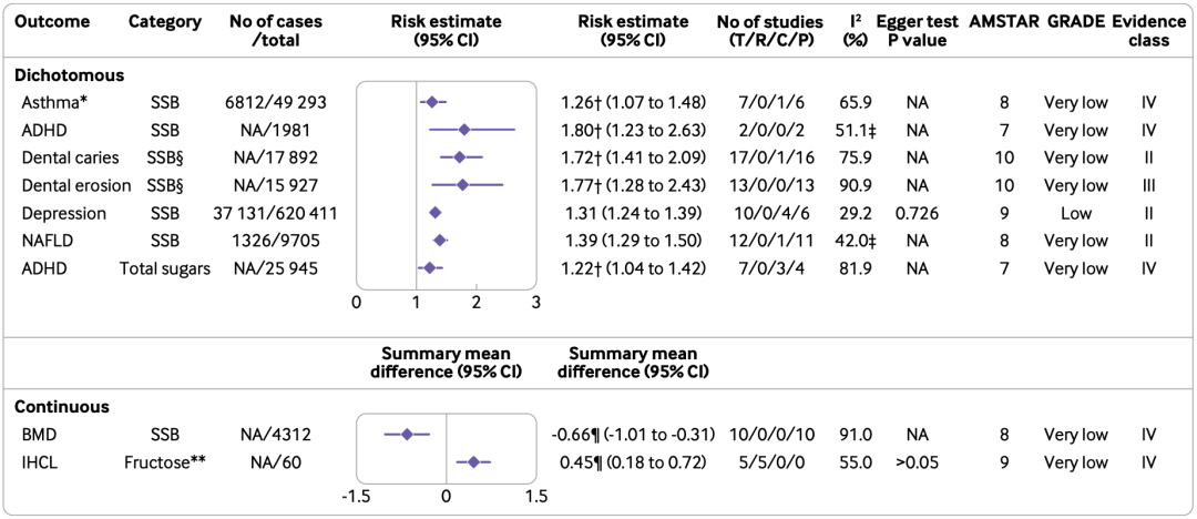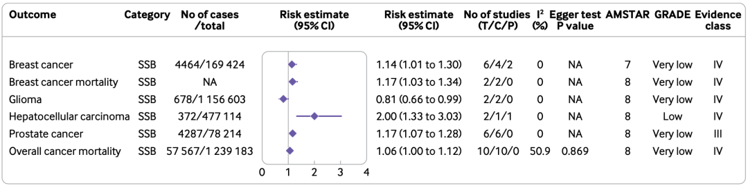 它们分别是:胶质瘤(含糖饮料)、总胆固醇(含糖饮料)、2型糖尿病(蔗糖)和心血管疾病死亡率(蔗糖)。不过,这些有利的关联并没有强有力的证据支持,因此对这些结果的解释应谨慎。