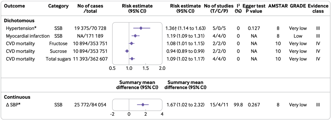 膳食糖摄入与心血管结局之间的有害关联,包括冠心病、心血管疾病、心血管疾病死亡率、儿童和青少年高血压、成人高血压、心肌梗塞、儿童和青少年收缩压变化,以及中风。
