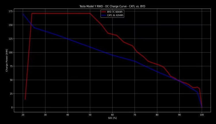 回到这批 Model Y。截图显示,新车接入充电插头后几乎,这块来自比亚迪的60度电池包很快就爬到170kW左右的高功率,并且能够一直维持直到50%的电量才降低功率。相比之下,旧车插电后功率就从170kW开始匀速下降。