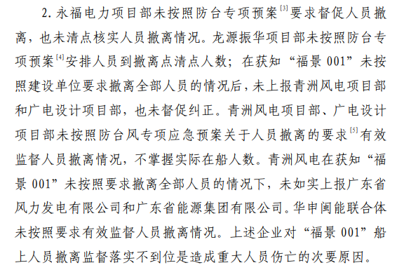永福股份(又称“永福电力”)项目部未按照防台专项预案要求督促人员撤离,也未清点核实人员撤离情况。龙源振华项目部未按照防台专项预案安排人员到撤离点清点人数;在获知“福景001”未按照建设单位要求撤离全部人员的情况后,未上报青洲风电项目部和广电设计项目部,也未督促纠正。青洲风电项目部、广电设计项目部未按照防台风专项应急预案关于人员撤离的要求有效监督人员撤离情况,不掌握实际在船人数。青洲风电在获知“福景001”未按照要求撤离全部人员的情况下,未如实上报广东省风力发电有限公司和广东省能源集团有限公司。华申闽能联合体未按照要求有效监督人员撤离情况。