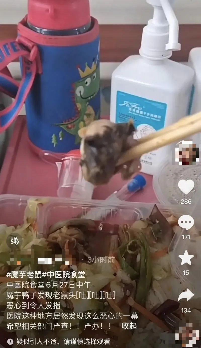 有个细节是,据报道,医院工作人员回应称,该院食堂不能堂食,都为订餐。出现老鼠头的情况,院方正和相关部门在调查。另有相关工作人员表示,“这个食堂不是我们医院自己办的,是通过政府网站招标进来的第三方食堂,之前从未发生过这种事情。”即便相关说法属实,涉事医院也不能撇清责任,更不能若无其事。