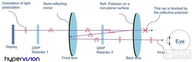 Pancake通常由一片或多片透镜组成,比如:PICO 4采用单片透镜,而Quest Pro则基于多片透镜。上图是以2片透镜Pancake为例,其结构包含以下几种组件:2个1/4波片(延迟器)、半反射透镜、反射式偏振器。
