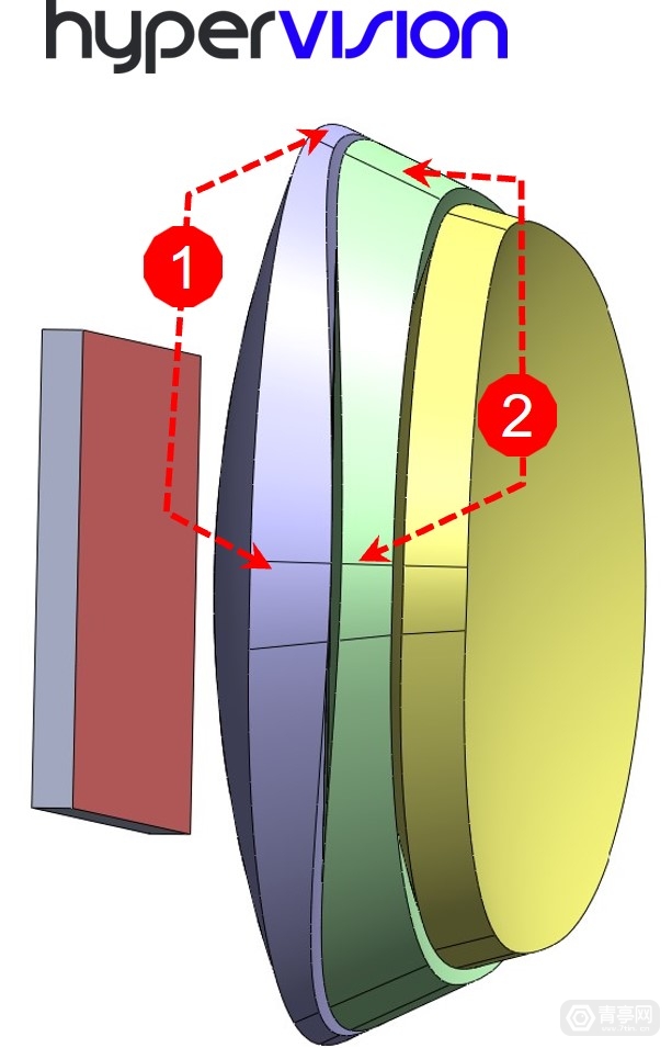Vision Pro光学透镜在靠近人眼的位置为凹面,好处是在实现相对紧凑光学结构的同时,还能提供大视场角。通过分析苹果公开的透镜和Micro OLED屏幕图片,以及大致的尺寸,HyperVision作出以下假设:
