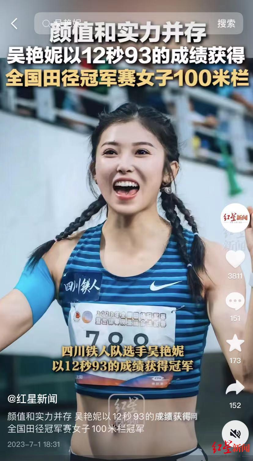 ↑吴艳妮比赛图片。受访者供图6月29日,2023全国田径冠军赛暨世锦赛及亚运会选拔赛女子100米栏决赛在辽宁沈阳举行,四川铁人队选手吴艳妮,以12秒93的成绩勇夺冠军。她在赛后接受媒体采访时说:“这只是我的一个开始,希望我们女子跨栏走向世界,走向最高领奖台!”
