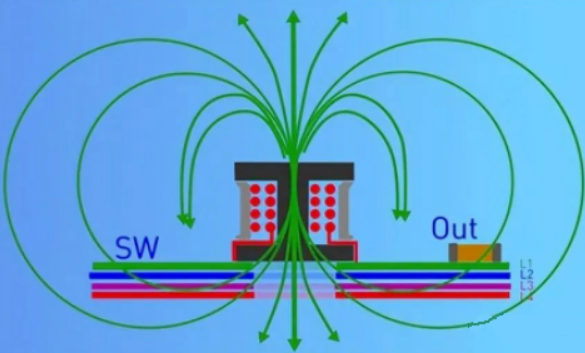 当Boost升压正常工作时,电感中流过负载电流,形成回路。由于开关管的存在,电流是动态变化的,由此可形成电感的磁感线,在导体的表面部分磁感线回形成封闭的磁回路,部分磁路会形成漏磁溢出到空气中。如果电感底部没有敷铜时,从电感中溢出的磁感线会在整个电源系统中存在,使系统没有相对安静的空间,会造成EMI的性能下降。