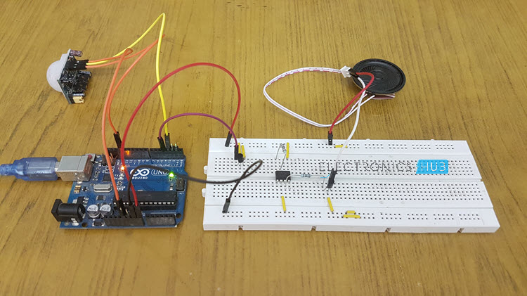 Arduino UNO 根据 PIR 传感器的数字信号触发 UM 3561 警报器集成电路。这样,当检测到有人时,它就会发出声音。