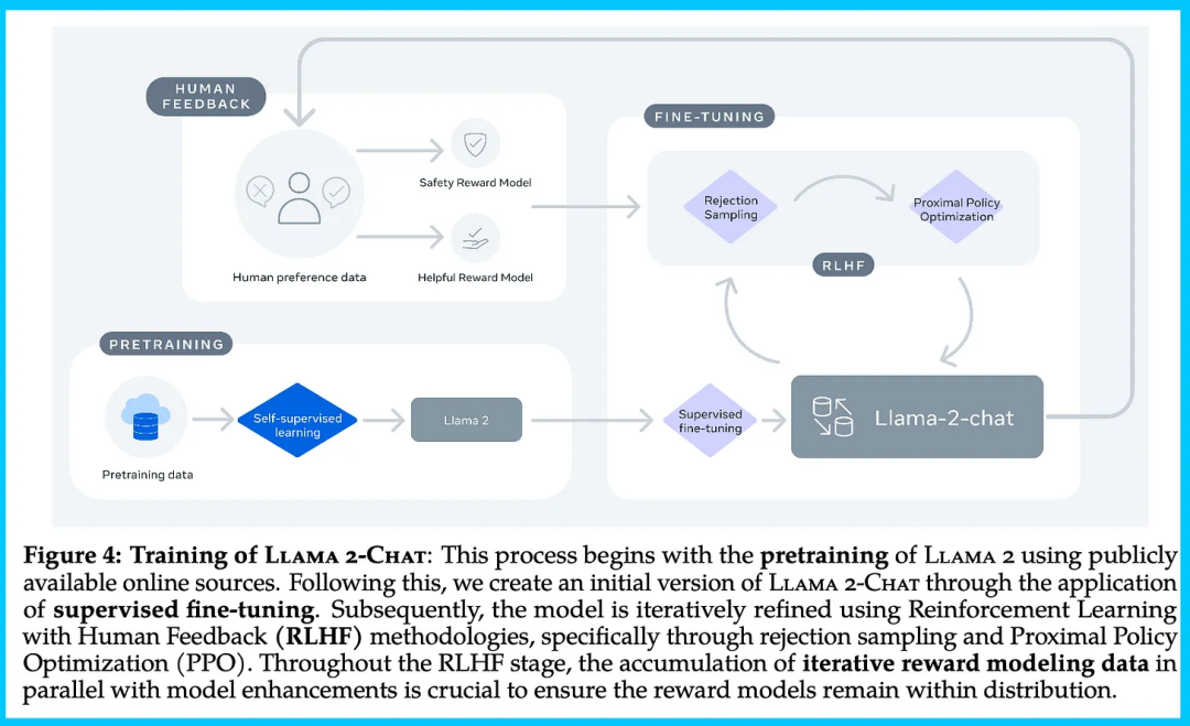 下图为 Llama 2-Chat 的训练 pipeline。Meta 在偏好数据上训练奖励模型,然后用强化学习对其进行优化,以提高模型质量。