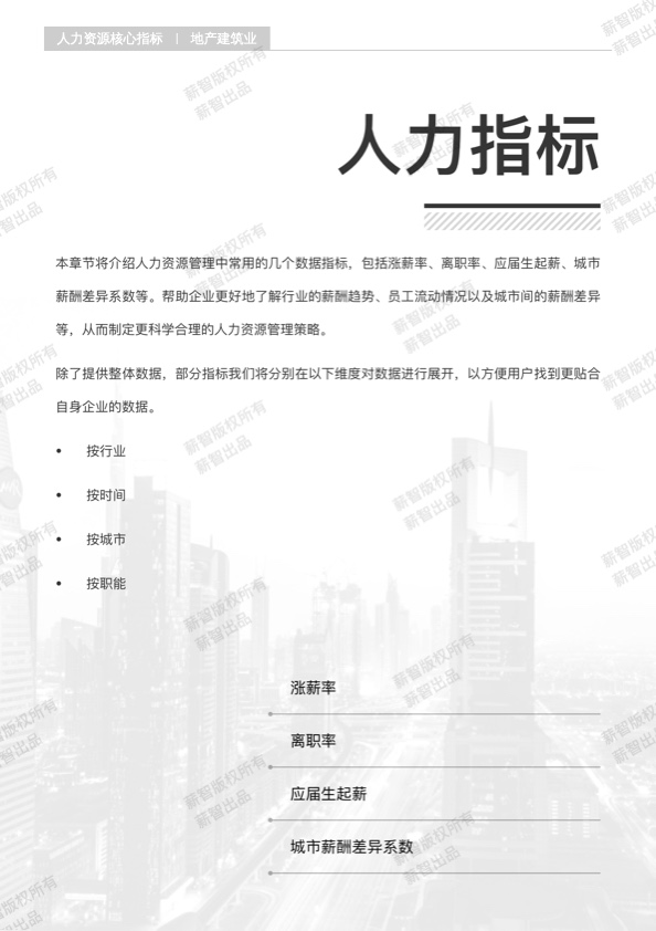 本章节将介绍人力资源管理中常用的几个数据指标,包括涨薪率、离职率、应届生起薪、城市薪酬差异系数等。帮助企业更好地了解行业的薪酬趋势、员工流动情况以及城市间的薪酬差异等,从而制定更科学合理的人力资源管理策略。