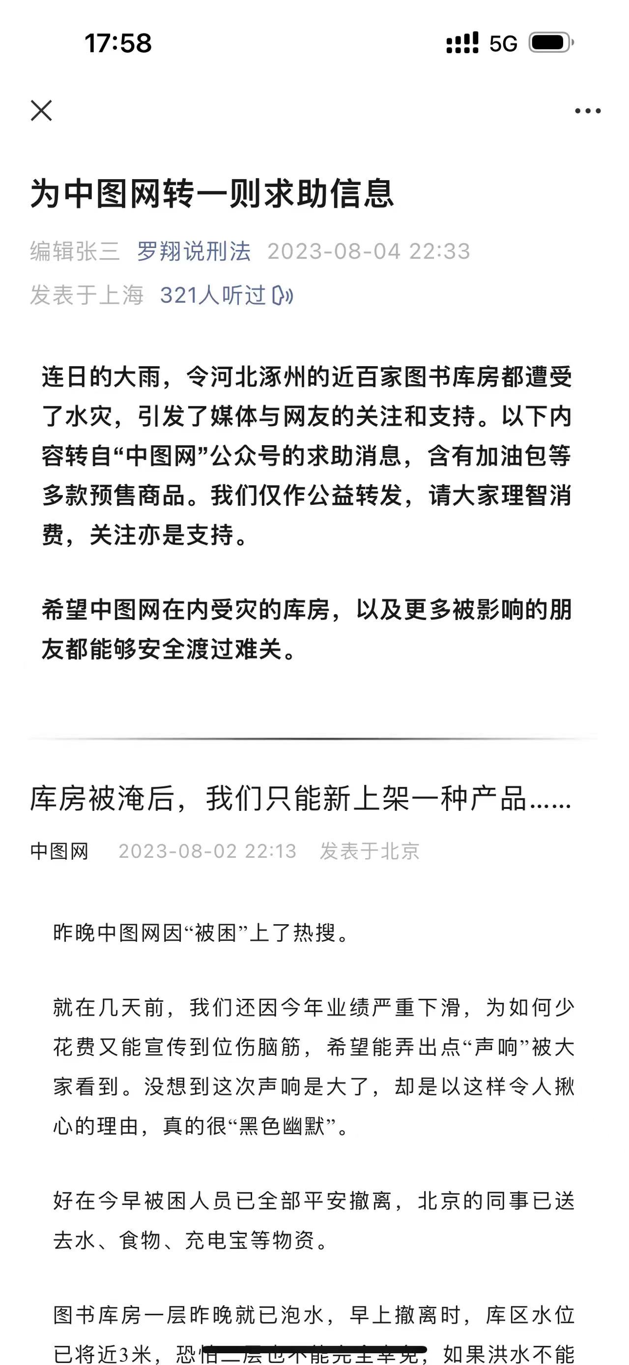 8月4日晚,公众号“罗翔说刑法”发布一篇名为《为中图网转一则求助信息》的文章,其中提到,“以下内容转自“中图网”公众号的求助消息,含有加油包等多款预售商品。我们仅作公益转发….希望中图网在内受灾的库房,以及更多被影响的朋友都能度过难关。”