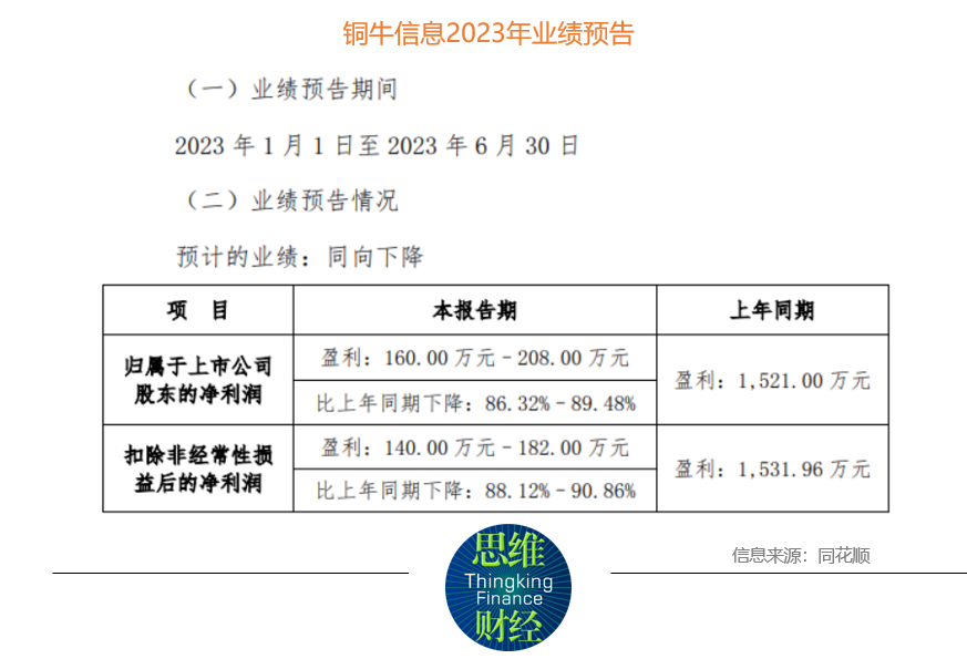 7月25日晚间,铜牛信息披露业绩预告表示,预计2023年上半年实现归母净利润为160万元至208万元,同比下降86.32%至89.48%;扣非净利润为140万元至182万元,同比下降88.12%至90.86%。