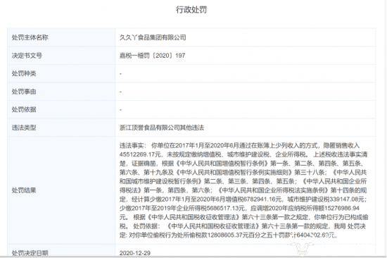 此外,公司也曾在去年底因存在偷税行为被嘉兴市税务局处以罚款 640.43 万元,这笔数目对于久久丫来说还是不小的。嘉兴市税务机关的处罚书写着“违法事实”是: 你单位在2017年1月至2020年6月通过在账上少列收入的方式,隐匿销售收入45512269.17元,未按规定缴纳增值税城市维护建设税、企业所得税。上述税收违法事实清楚,证据确凿。