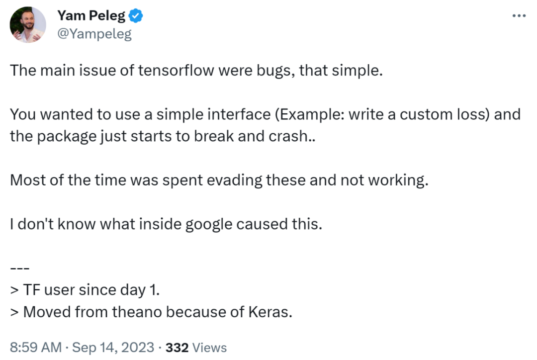 著名软件开发者、Deep trading 创始人 Yam Peleg 表示,TensorFlow 的主要问题在于 bug。当你想使用一个简单的界面(如编写自定义损失)时,包不一会就损坏和崩溃了。因此不得不将大多数时间花在如何回避这些 bug 而不是工作上。