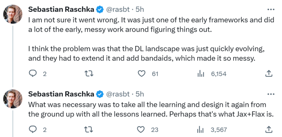 他不确定 TensorFlow 出了什么问题,作为早期框架之一,已经进行很多工作来解决问题。他认为问题是随着深度学习领域快速发展,谷歌不得不扩展 TensorFlow 并添加各种补丁,这才导致它如此混乱。现在必须吸取所有经验教训从头开始重新设计,也许这就是谷歌推广 JAX+Flax 的原因吧。