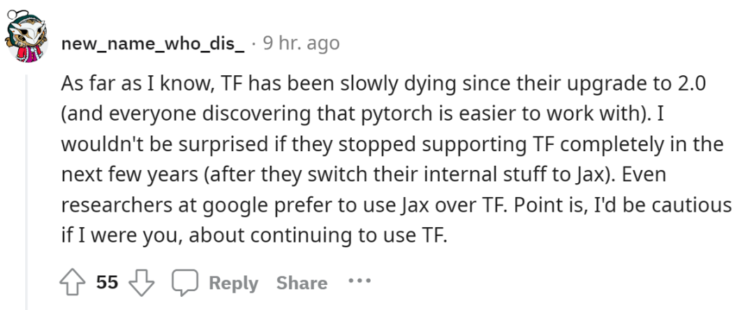 另一位网友也认为,自 TensorFlow 升级到 2.0 以来,便开始慢慢死去。如果谷歌在接下来几年完全停止支持 TensorFlow 并在内部切换成 JAX,他不会感到惊讶。