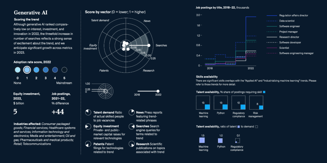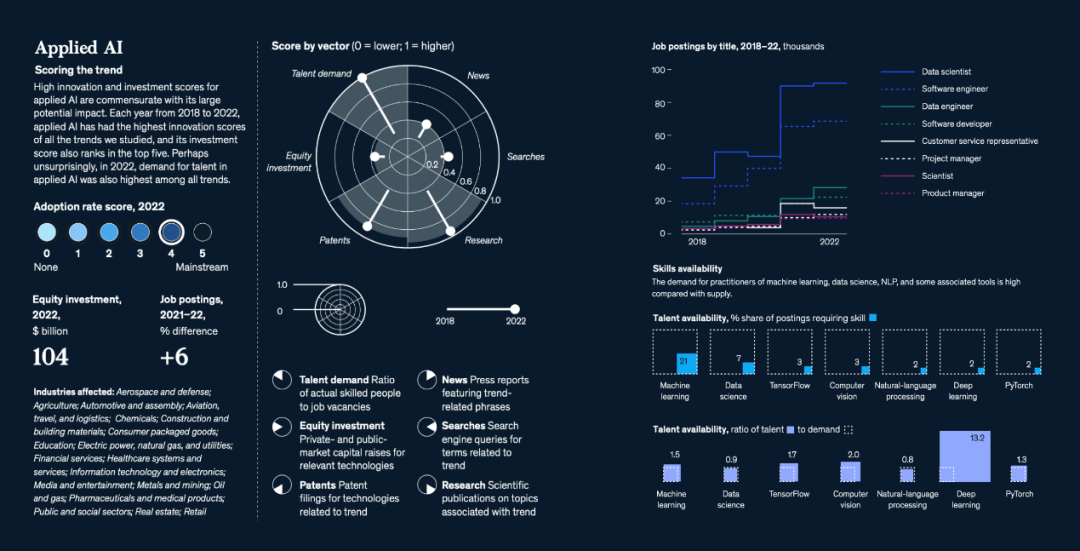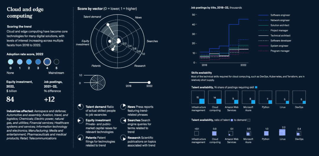 与往年不同的是,麦肯锡增加了一个重要的新分析维度——人才(talent)——人才短缺是创新与增长的头号“敌人”。数据显示,与2021年相比,2022年全球职位与文中提到的15个科技趋势相关的领域的职位发布增长了15%,但每个职位的合格从业者数量还不到全球平均水平的一半。