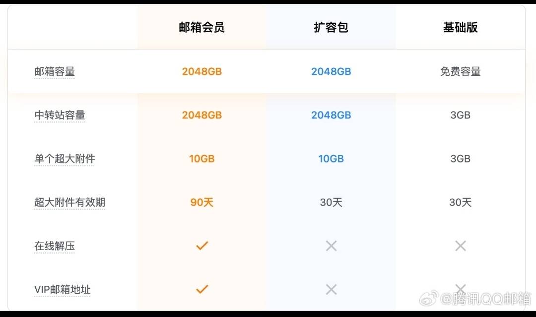 记者对比发现,QQ邮箱推出的会员付费服务,包括邮箱容量2048G、中转站容量2048G、中转站单个超大附件10G等容量扩容服务,以及中转站超大附件90天有效期、在线解压、VIP邮箱地址等增值服务。而其免费邮箱服务仍然保留,中转站容量为3GB,单个附件也只支持3GB,附件有效期为30天。同时,用户依然可以根据需求定时免费为自己的邮箱容量扩容。
