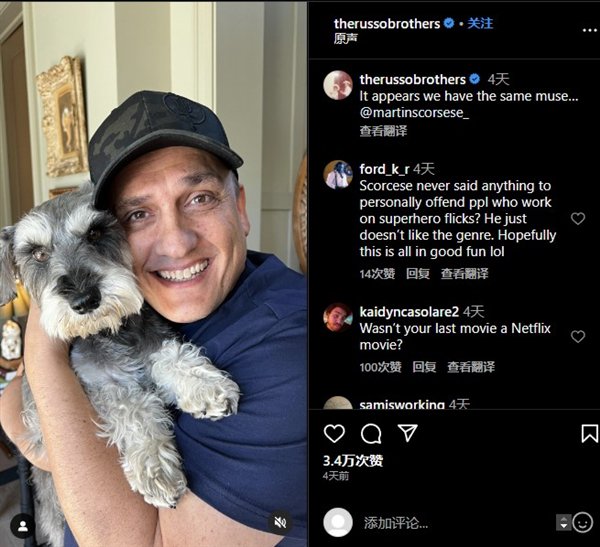 马丁·斯科塞斯的女儿在抖音上发了一条短视频,内容是老马逗弄他的爱犬“奥斯卡”——拍了无数大片只拿过一个喜剧类艾美奖的乔·罗素坐不住了,酸溜溜地表示:“快看,他有一条雪瑞纳,名叫奥斯卡,可爱哦”,接着罗素隆重介绍自己的狗:“加油,票房。”