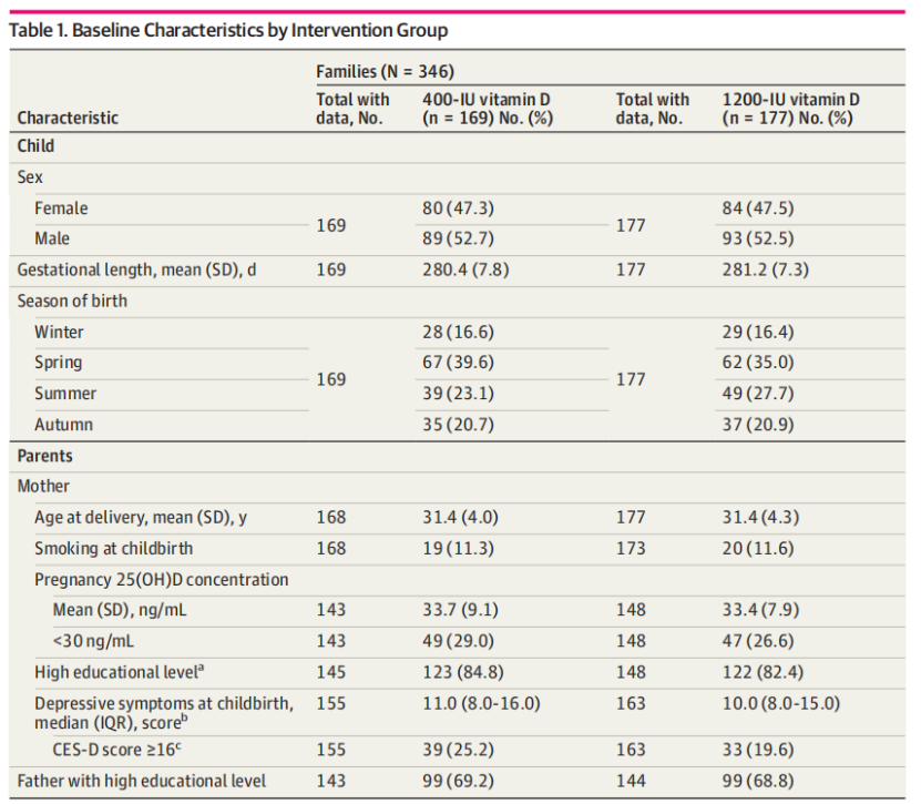 研究人员对VIDI研究中的346名儿童进行了后续长期随访和二次分析,169名儿童(34.6%)接受400IU剂量的维生素D3补充剂,177名儿童(36.4%)接受1200IU剂量的补充剂,利用儿童行为检查表(CBCL)评估儿童精神状况(内化、外化和总问题的综合得分)。