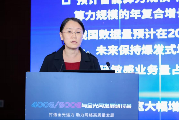 算力方面,我国算力规模,尤其是智能算力规模正在高速增长,预计智能算力规模年复合增长率为52.3%,同期通用算力规模的年复合增长率为18.5%。数据方面,我国数据量预计在2026年达到23.5ZB,将位居全球第一,未来将保持爆发式增长。数据中心的带宽大幅增长,对运力枢纽出口带宽带来巨大挑战,同时,用户对时延敏感业务量占比达70%,稳定可靠的低时延需求巨大。