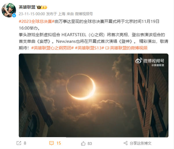 快科技11月15日消息,今日,“英雄联盟”官微宣布,2023英雄联盟全球总决赛开幕式将于北京时间11月19日16:00(本周日)举办。