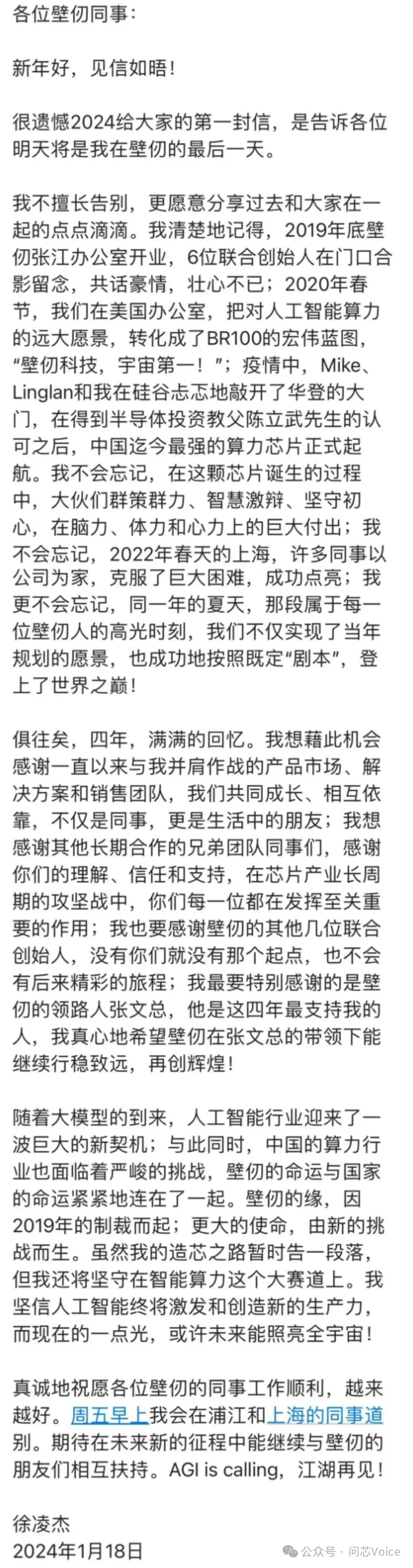 GPU新创公司壁仞科技再度传出高管离职,继2023年初联合创始人焦国方离职,近日传出联合创始人徐凌杰也离开公司。在徐凌杰给壁仞同事的信中流露着满满的不舍之情,同时也透露“期待在未来新的征程中能继续与壁仞的朋友们互相扶持。AGI(通用人工智能)is calling, 江湖再见!”