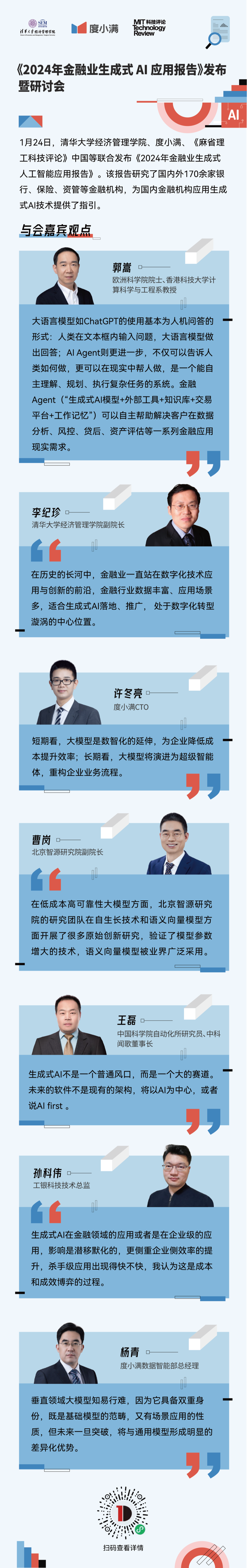 2024 年 1 月 24 日,清华大学经济管理学院、度小满、《麻省理工科技评论》中国、清华大学经济管理学院动态竞争与创新战略研究中心共同主办的《2024 年金融业生成式 AI 应用报告》发布暨研讨会在清华大学经济管理学院顺利举行。