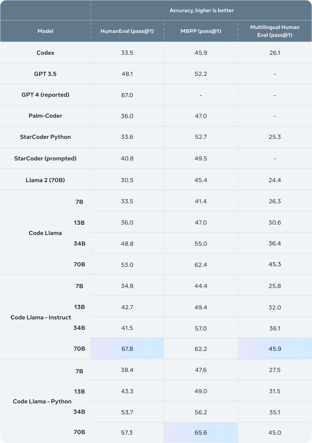 在 HumanEval 基准测试中,Code Llama 70B 的准确率达到了 53%,优于 GPT-3.5 的 48.1%,进一步接近 OpenAI 论文报告中 GPT-4 的 67%。