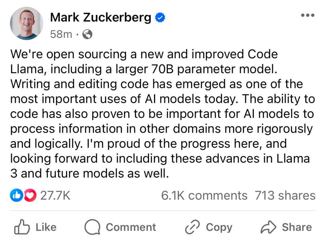 我们正在开源一个全新的改进版 Code Llama,包括一个更大的 70B 参数模型。编写和编辑代码已成为当今人工智能模型最重要的用途之一。事实证明,编写代码的能力对于人工智能模型更严谨、更合理地处理其他领域的信息也非常重要。我为这一进展感到自豪,并期待着将这些进展纳入 Llama 3 和未来的模型中。