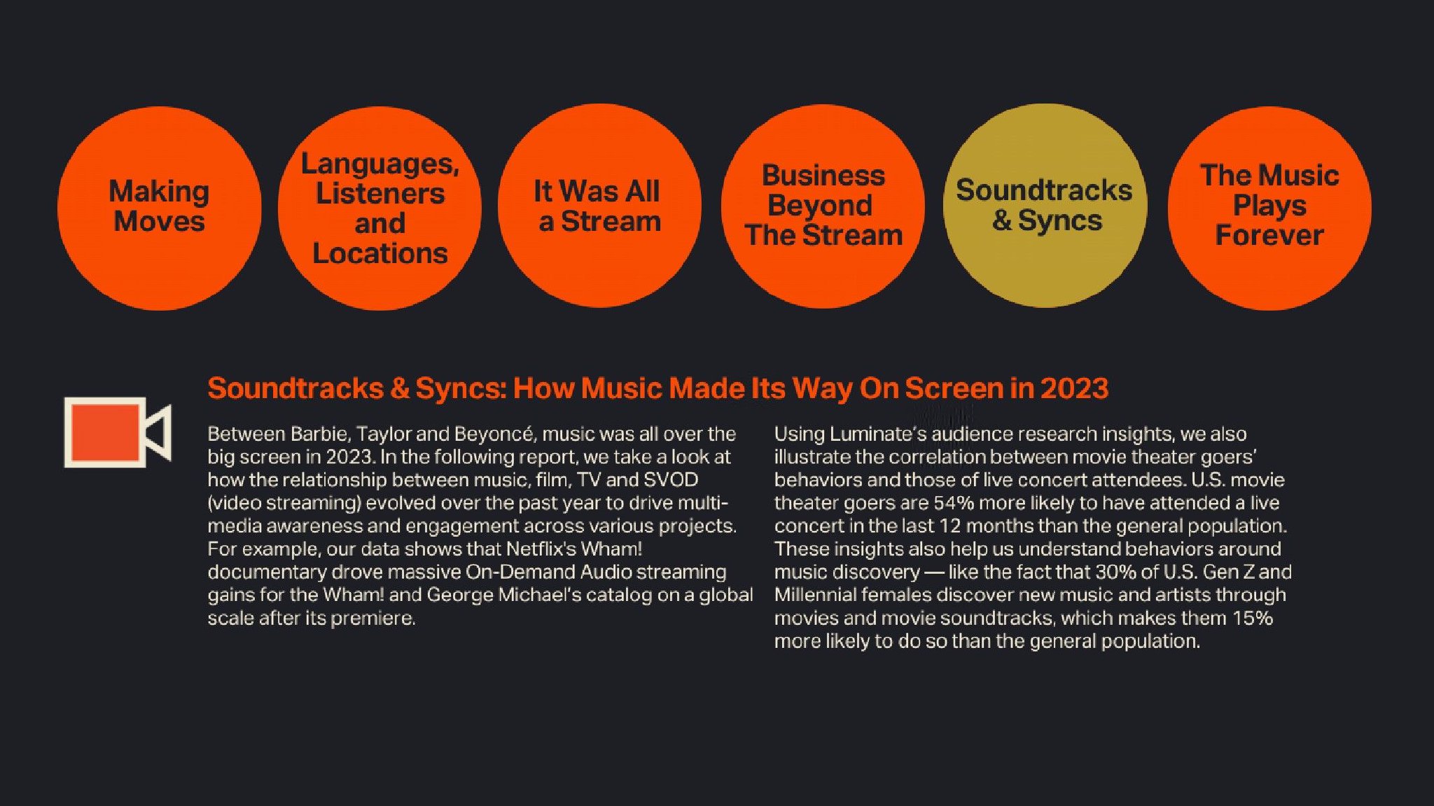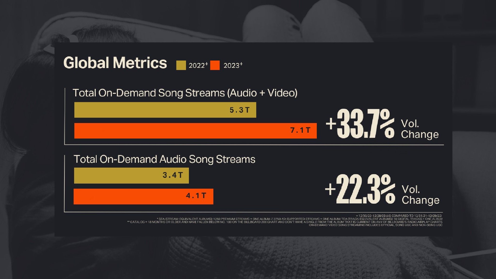 最新的Luminate数据显示,从2022年到2023年,音频点播流媒体活动总量增长了12.70%。