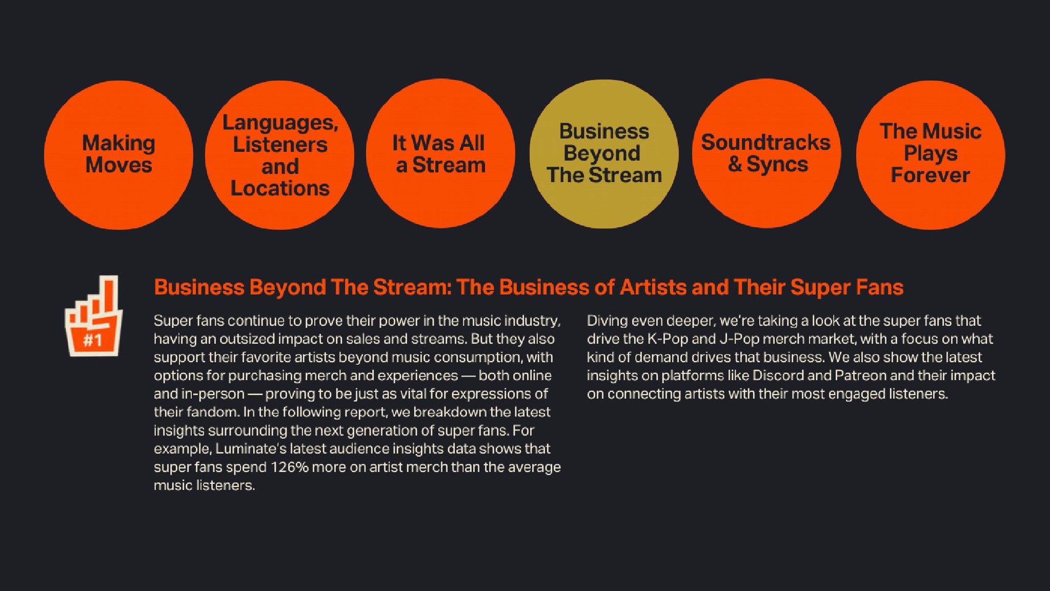 超级粉丝继续证明他们在音乐行业的力量,对销量和流媒体产生了巨大的影响。Luminate最新的受众洞察数据显示,超级粉丝在艺人商品上的花费比普通音乐听众高出126%。