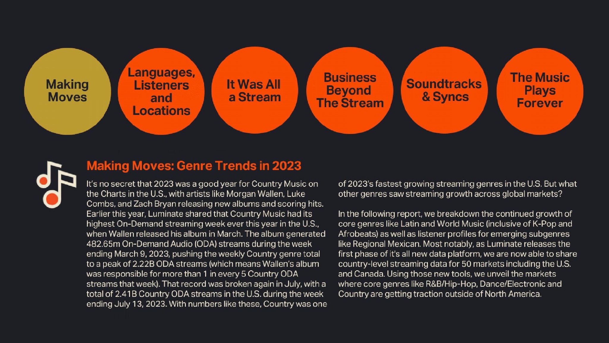 Luminate发布了“2023年年底音乐报告”。2023年是美国乡村音乐的好年份。早些时候,Morgan Wallen、 LukeCombs 和Zach Bryan等歌手发布了新专辑和热门歌曲,推动2023年乡村音乐在美国的点播流媒体周创下了有史以来的最高纪录。