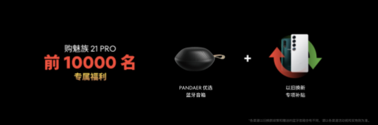 为了让更多用户提前享受到更多优惠福利,魅族还为前 10000 名购买魅族 21 PRO 的魅友准备专属赠品 —— PANDAER 优选蓝牙音箱和以旧换新专项补贴。即日起,前往魅族商城、各大授权电商平台和魅族线下门店预定新机,可享有至高 24 期免息、180 天以换代修等优惠权益,学生线上购机还可享受额外 100 元优惠。