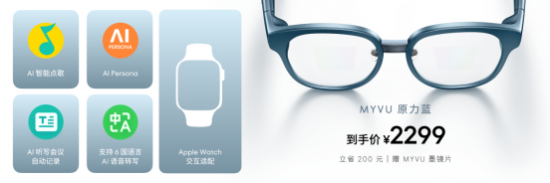 MYVU 还率先实现与 Apple Watch 的互联互通,让 iOS 用户也能享受到 MYVU 带来的全天候时尚 AR 智能体验。此外,MYVU 还推出全新配色「原力蓝」,MYVU 原力蓝购买立省 200 元并赠送价值 349 元的 MYVU 墨镜片,到手价 2299 元,即日起在线上线下全渠道发售。