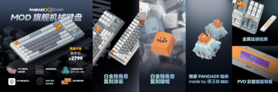 魅族 PANDAER 还与 IQUNIX 携手合作,将客制化键盘提升到旗舰水平,带来全新的 PANDAER × IQUNIX 白金独角兽 MOD 机械键盘。白金独角兽 MOD 旗舰级机械键盘拥有白金独角兽涂装,采用多种工艺全铝机身,并独家定制「PANDAER 璞玉轴」,具备耐磨、自润滑以及低噪音的特点,让每一次敲击输入都成为享受。