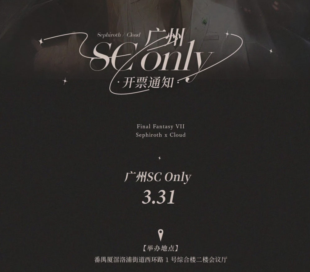 但邪门从来都不代表不好磕。实际上,SC一直都是FF7一众CP里影响力最大的那个。数不胜数的同人二创、断档式领先的周边数量,本月底国内的SC粉丝甚至还将召开一场SC Only,感兴趣的朋友可以关注一下。