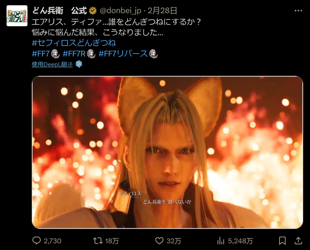 《重生》发售前夕,FF7与日本日清泡面品牌咚兵卫联动,官方虽然嘴里说着什么“在爱丽丝和蒂法之间纠结了很久”,但他们心里其实可明白了,萨菲罗斯显然才是最好卖的。