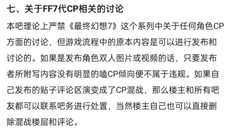 总的来说,“最终幻想7吧”和“FF7吧”各执一词,各有各的道理,假如你是一位对CP无感的中立玩家,想必多半也会在两家粉丝的轮番轰炸中对自己的信念产生动摇。至于主吧“最终幻想吧”,早在几年前的吧务大换血过后就已明令禁止FF7的CP讨论,自然也就少了许多骂战与争议。