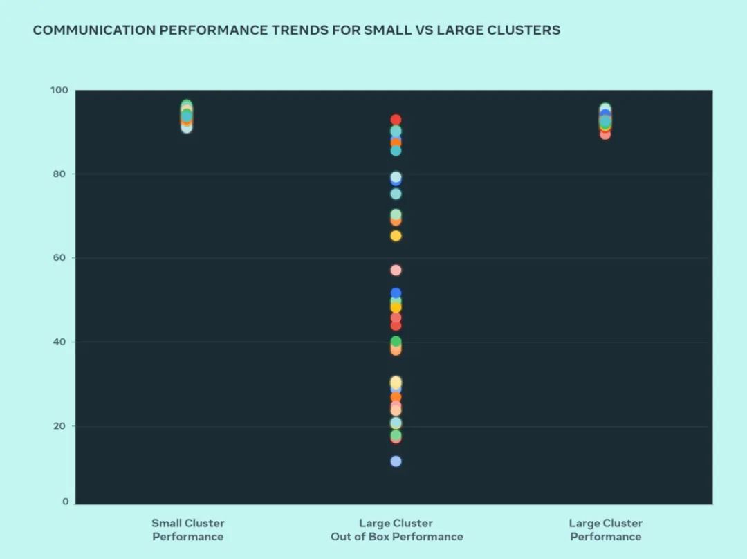 与优化的小型集群性能相比,大型集群的开箱即用性能最初很差且不一致。为了解决这个问题,Meta 对内部作业调度程序通过网络拓扑感知来调的方式进行了一些更改,这带来了延迟优势并最大限度地减少了流向网络上层的流量。