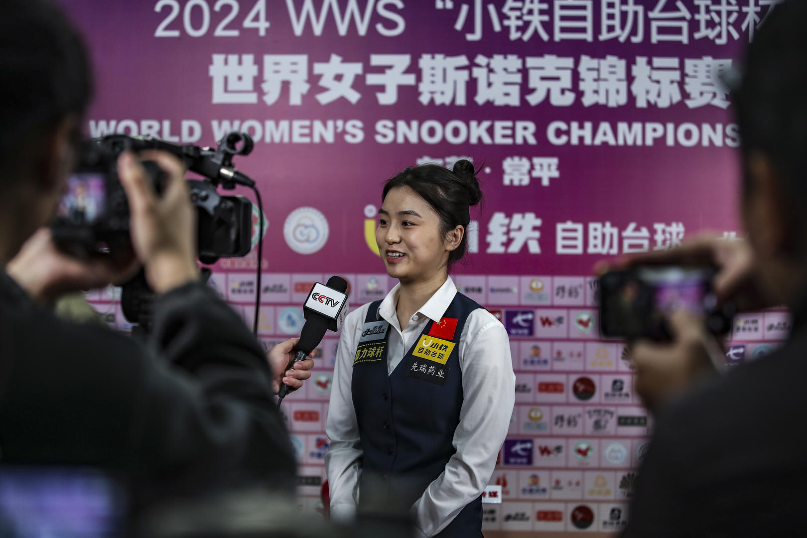 2024年3月14日,广东东莞,2024世界女子斯诺克锦标赛U21决赛,白雨露3-0纳如查夺冠,白雨露接受采访 图据视觉中国