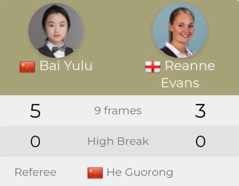 输掉去年的女子世锦赛决赛后,白雨露也错失了为期两个赛季的职业资格。本届女子世锦赛,包括了正赛、U21锦标赛以及元老赛,白雨露报名了正赛以及U21锦标赛两个项目。在此前的U21锦标赛上,她已经拿到了冠军。而在正赛中,白雨露状态相当出色,在多次打出单杆破百的情况下一路挺进到半决赛,碰到了12届女子世锦赛冠军、有“女皇”之称的埃文斯。去年的女子世锦赛半决赛,白雨露就5比3逆转击败埃文斯进入决赛的,而这一幕又在本届半决赛中重演。埃文斯在3比0领先的大好局势情况下,被白雨露打出“五连鞭”逆转,最终白雨露再次以5比3淘汰了埃文斯,晋级决赛。