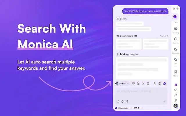 另一款受到关注的Chrome插件——Monica,其创始人肖弘在阐述产品价值的时候提到,他们做了很多很具象的场景里面的工作,比如回邮件、帮用户总结文章或者在用户打开一个YouTube视频的时候,帮其总结每段内容。这些功能都通过插件潜入浏览器,因为浏览器插件在海外是一个比较主流的产品形态。