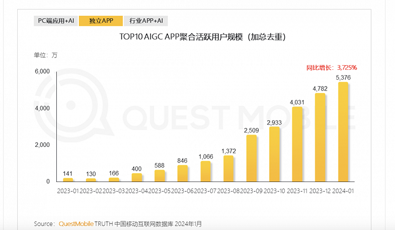 C端用户也正对AIGC报以极大热情。根据QuestMobile的洞察,独立APP的需求持续增长。2024年1月,TOP10 APP去重用户规模同比增长37倍。头部APP的活跃用户超5千万。