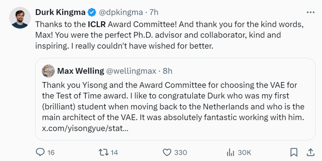 在得知获奖的消息后,Kingma、Max Welling 师徒俩人还进行了互动: