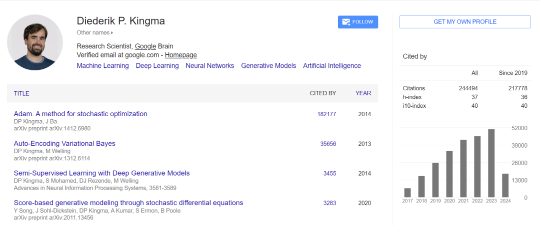 Kingma 主要研究方向是可扩展的机器学习方法,重点是生成模型。他是变分自编码器 (VAE,即本次获奖研究)、Adam 优化器、Glow 和变分扩散模型等研究的主要作者。根据 Google Scholar 显示,Kingma 的论文引用量达到 24 万多次。