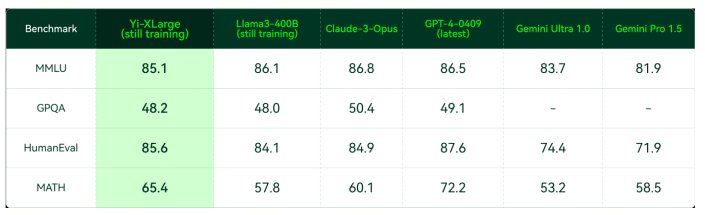 发布会上,李开复博士还宣布,零一万物已启动下一代 Yi-XLarge MoE 模型训练,将冲击 GPT-5 的性能与创新性。从 MMLU、GPQA、HumanEval、MATH 等权威评测集中,仍在初期训练中的 Yi-XLarge MoE 已经与 Claude-3-Opus、GPT4-0409 等国际厂商的最新旗舰模型互有胜负,训练完成后的性能令人期待。