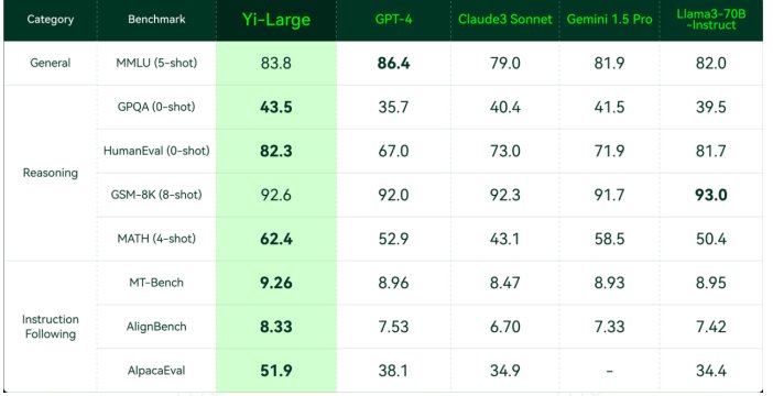 在更全面的大模型综合能力评测中,Yi-Large 多数指标超越 GPT4、Claude3、Google Gemini 1.5 等同级模型,达到首位。在通用能力、代码生成、数学推理、指令遵循方面都取得了优于全球领跑者的成绩,稳稳跻身世界范围内的第一梯队。随着各家大模型能力进入到力求对标GPT4的新阶段,大模型评测的重点也开始由简单的通用能力转向数学、代码等复杂推理能力。在针对代码生成能力的 HumanEval、针对数学推理能力的 GSM-8K和 MATH、以及针对领域专家能力的GPQA等评测集上,Yi-Large也取得了具有绝对优势的成绩。