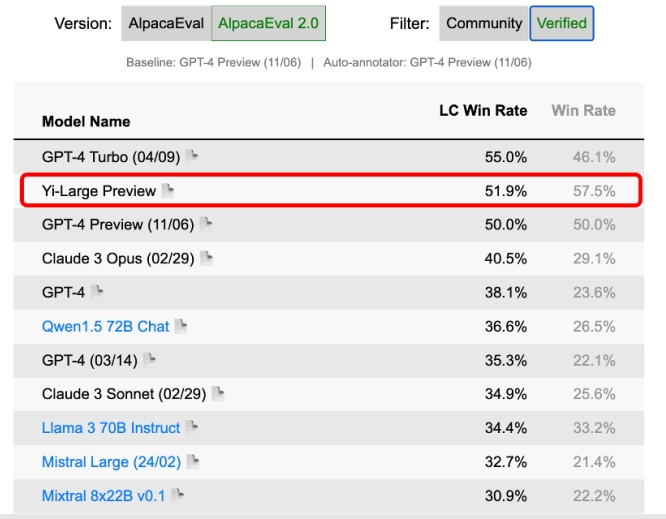 半年后,零一万物正式发布千亿参数规模的 Yi-Large,在第三方权威评测中,零一万物 Yi 模型在全球头部大模型的中英文双语 PK 上表现出色。最新出炉的斯坦福评测机构 AlpacaEval 2.0 经官方认证的模型排行榜上,Yi-Large 模型的英语能力主要指标 LC Win Rate(控制回复的长度) 排到了世界第二,仅次于 GPT-4 Turbo,Win Rate 更排到了世界第一,此前国内模型中仅有 Yi 和 Qwen 曾经登上此榜单的前 20。