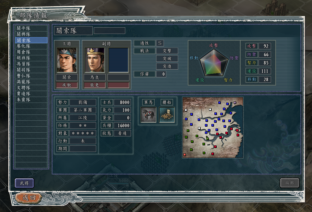 对手部队高质高量,硬拼毫无取胜可能;敌人的主将虽然智力不高,但有马良、伊籍等智力较高的文臣撑场面,很少中我的计略。另外敌人还用出了完全不似原版AI的配兵方式——多年前的我从未留意过这一点。