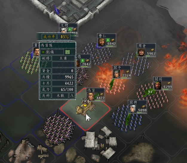 合肥之战里,就算我打不过,尚可破坏地图一旁的堤坝,用水计跟孙权拼个鱼死网破。而在樊城之战中,所有攻略都会让玩家在两军阵前放火,欺骗AI绕路,从而拖延时间,不然就难以取胜。